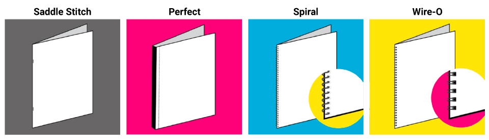 Saddle Stitch, Perfect Binding, Spiral, Wire-O, and additional processes.
